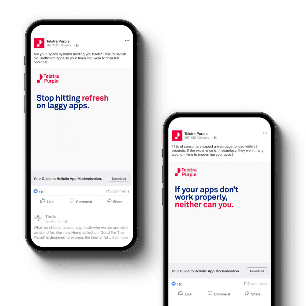 Telstra Purple, a sub-brand of Telstra, empowers businesses through tailored digital transformation strategies. For this campaign, our objective was to highlight the importance of app modernisation—encouraging organisations to unlock their full potential using Telstra Purple’s future-ready technology solutions and global partnerships.